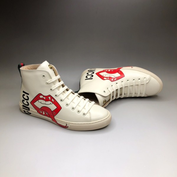 GUCCI 구찌 남녀공용 GG 로고 입 모양 프린트 하이탑 스니커즈 화이트